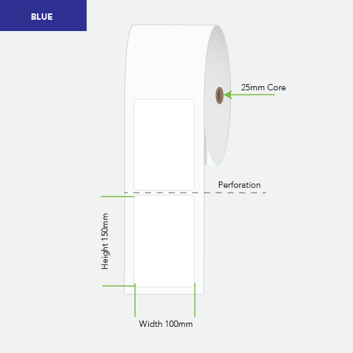 CaliborThermal Paper Label (DT) Flood Coated Blue Permanent Adhesive 100mm wide x 150mm deep 400 Labels per roll 1 Label across Perforated between each la...