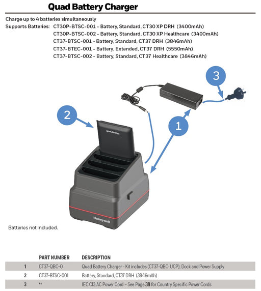 HoneywellCT37/CT30 XP QBC, kit includes quad battery charger(Cup:CT37-QBC-UCP), power supply, power cord must be ordered separately. For recharging up to fo...