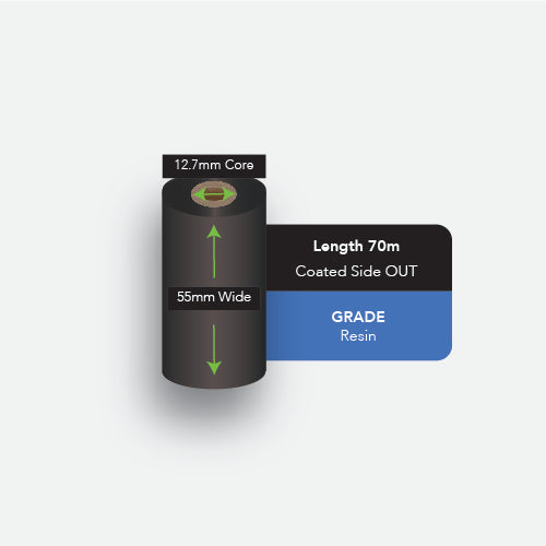 Calibor• Resin Thermal Transfer Ribbon. • For 2 inch Desktop printers (eg. TLP-2824). • 55mm wide (flush) x 70m length x ½ inch notched core/ CSO with n...